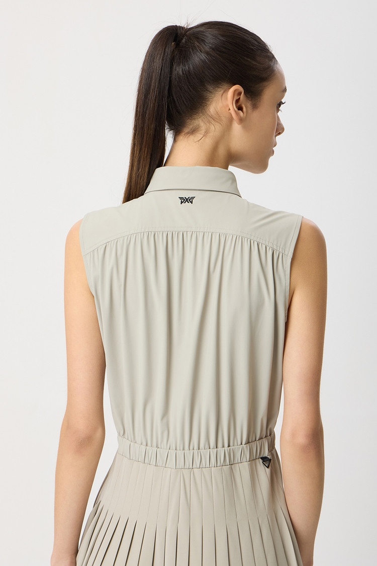 등판 요크, 어깨선을 따라 여성스러운 셔링과 스커트 뒷판 플리츠 디테일