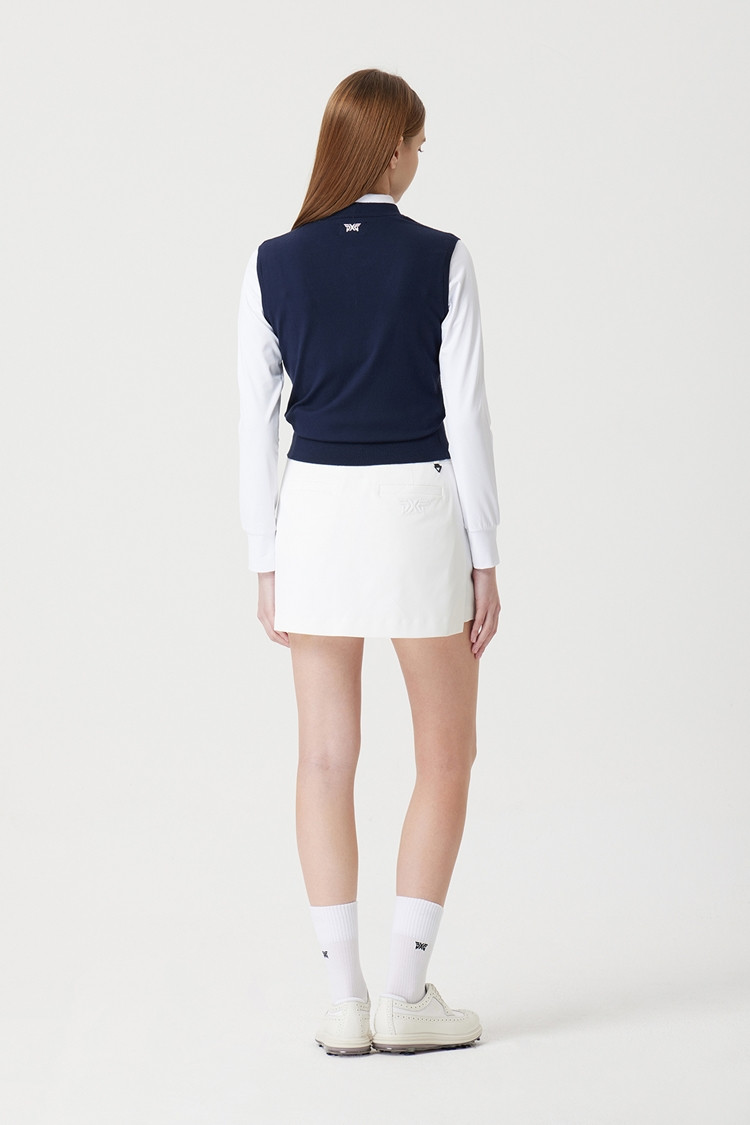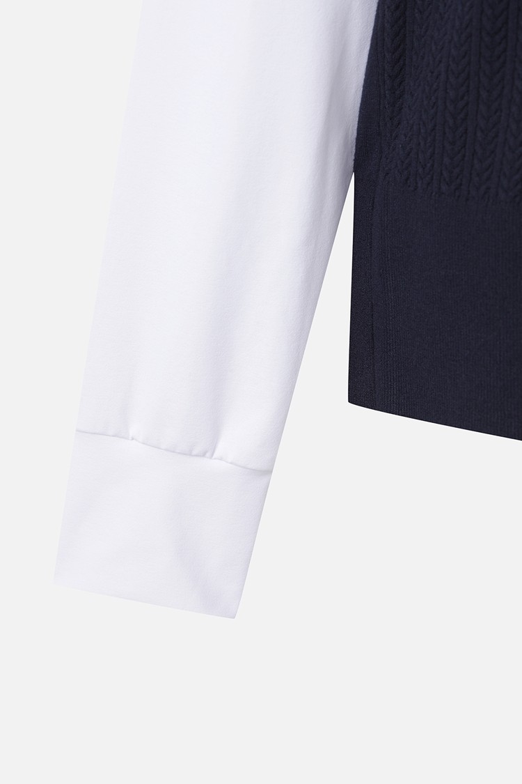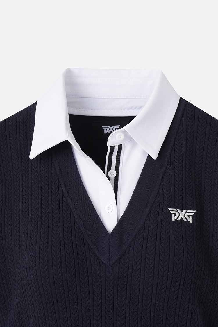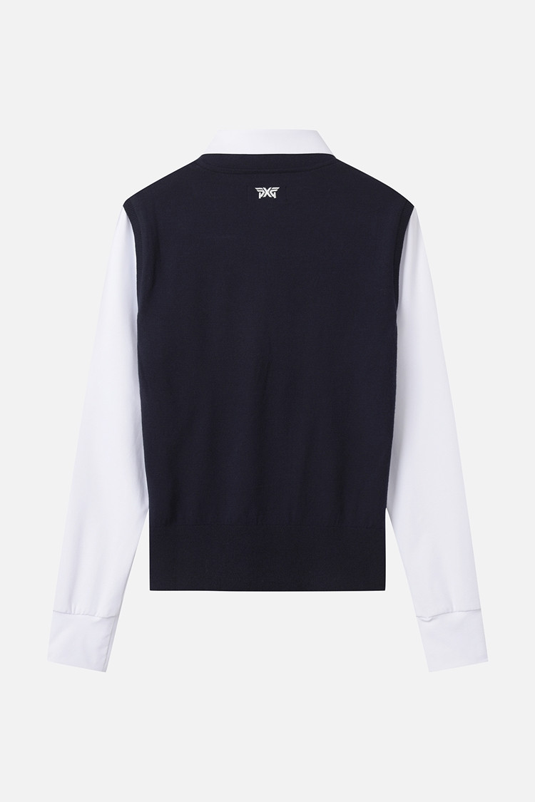 카라 이너에 니트 베스트를 함께 입은 듯한 페이크 레이어드 스타일