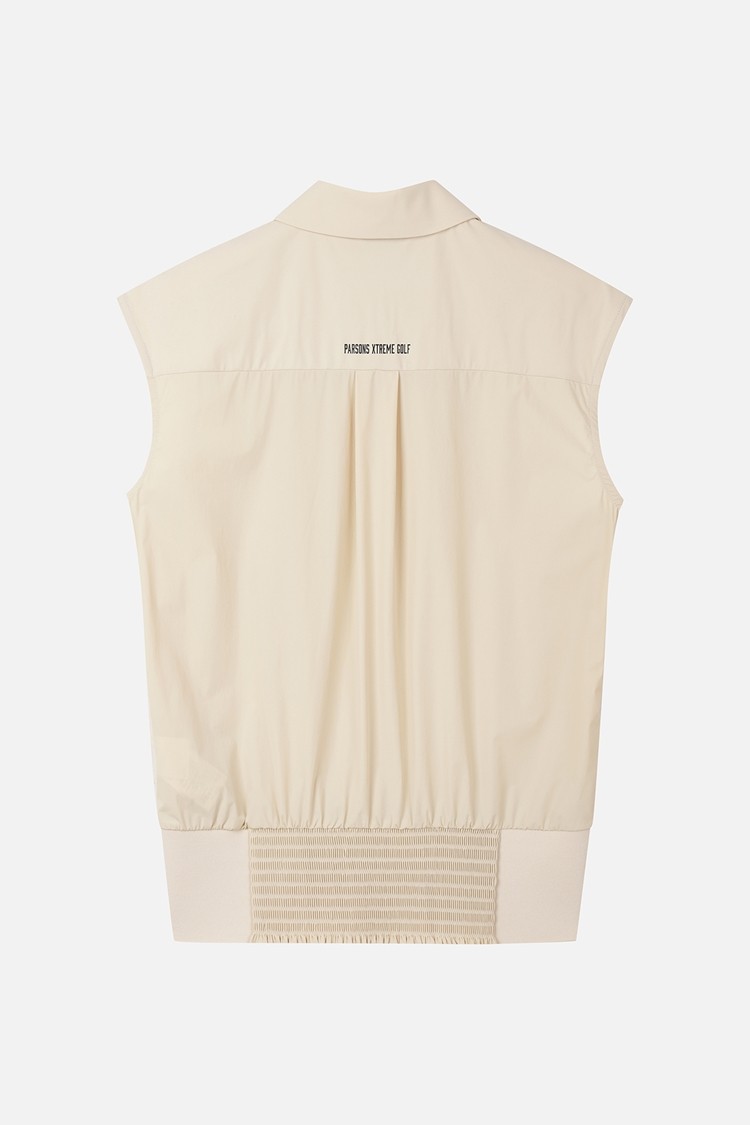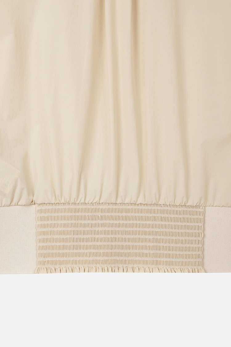 등판 배색 사용과 밑단 스모킹 셔링으로 여성스러운 디자인 포인트